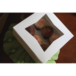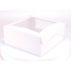 The Southern Champion® Tray 23053 bakery box is made of SBS paperboard, which is white on the inside and outside, has an attached tuck in lid and can be used to hold and carry baked goods. White SBS (solid bleached sulfate) paperboard is thicker and more rigid than paper, is suitable for holding baked goods and can be recycled just be sure to remove the window film before placing in the bin. It also can be printed with a logo or a business name. The attached lid tucks into the box to help secure its contents. A cellophane window provides a view of the box's contents. The lock corners facilitate assembly and enable the box to be folded flat for storage or transport. The box measures 10 x 10 x 5 in, which is the perfect size for a cake or other baked goods.