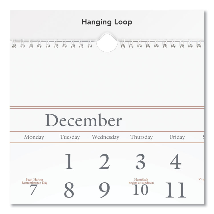 Vertical format calendar fits easily in compact spaces. Quality buff paper. Three months per page: past, current and future months. Large, easy-to-read numbers. Federal holidays highlighted. Chipboard backing; white wirebound with hanging loop. Printed on high-quality paper with superior ink bleed resistance. Dated: Yes; Academic Year: No; Calendar Format: Quarterly; Calendar Spread Format: Vertical: One Quarter per Page.