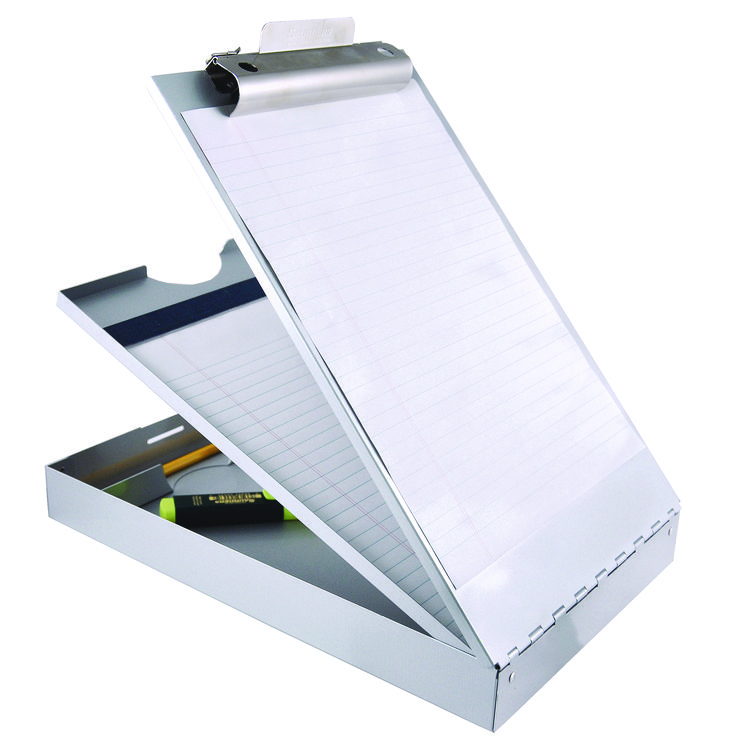 The Cruiser Mate is the ideal tool for law enforcement, salespeople, students, and more. High-capacity clip holds 1" of paper securely and includes a built-in license/card holder. Sturdy aluminum form holder features two separate storage trays. The bottom has a built-in pencil tray and 1" capacity for extra forms, reports, logs or tools. Additional 7/16" compartment for completed forms remains closed under the cover until needed. Upper tray is removable. Self-locking latch keeps the compartments securely fastened. Form holder is made of aluminum with a high percentage of recycled material. Holds Paper Size: 8.5 x 11; Clipboard Actual Size: 9 x 14; Clipboard Material: Recycled Aluminum; Clip Capacity: 1.5".