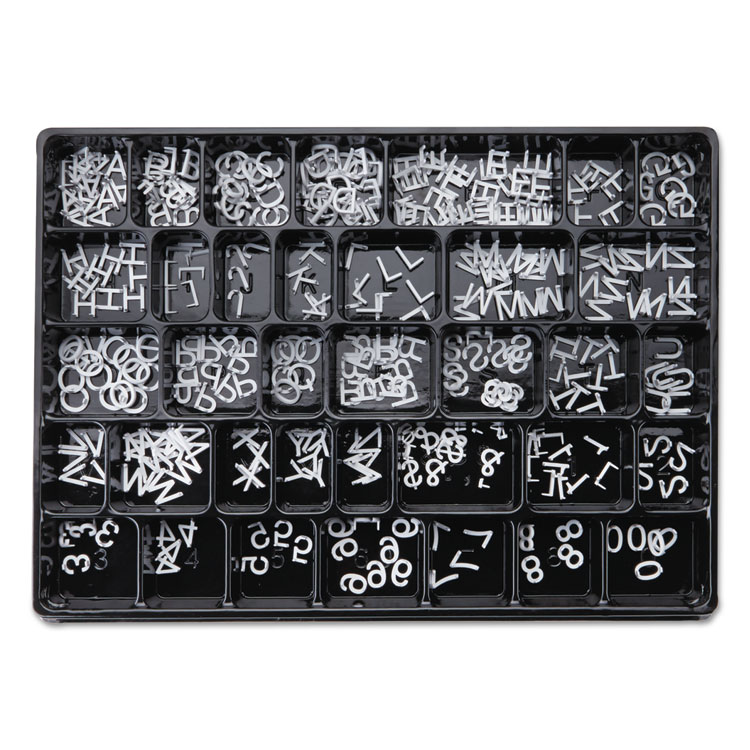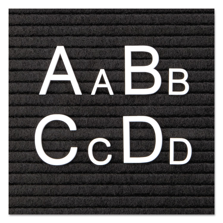 Create easy-to-read messages using reliable raised white lettering. Secure letters evenly and straightly with molded grooves on the back of each letter. 4400 Series for Felt Surfaces. Character Types: Letters; Math/Money Symbols; Numbers; Punctuation/Language Symbols; Character Style: Helvetica Uppercase; Character Mounting Type: Letter Board Inserts; Number of Pieces: 300.