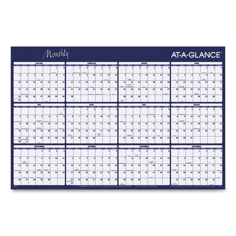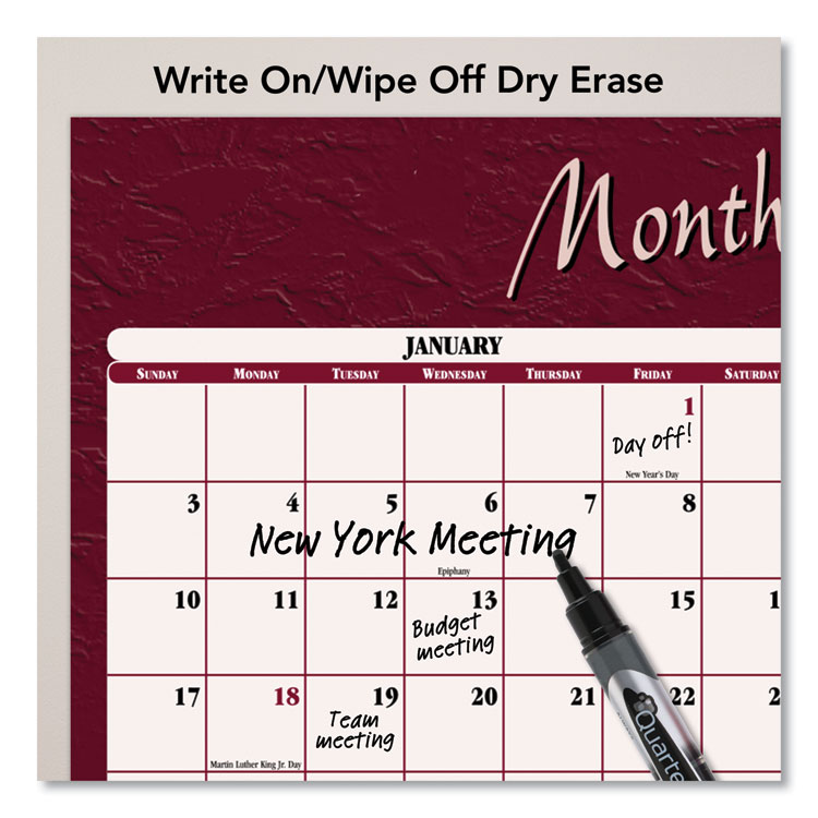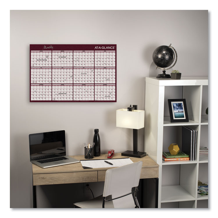 Plan and organize your year with this erasable and reversible extra-large wall calendar. It displays 12 months from January to December on each side and is great for personal or group use. Calendar is reversible for twice the planning power. One side is lined in red and the other side is in blue. Provides a convenient visual reference for long term planning. Erasable write-on/wipe-off surface lets you quickly revise plans. Simply wipe the calendar clean and start over. Two wet-erase markers are included for your convenience. Bold, large print allows for easier viewing and reading. Unruled daily blocks provide plenty of writing space for notes and reminders. Extra-large 48" x 32" page size calendar in horizontal format offers plenty of room to keep track of a busy schedule. Dated: Yes; Academic Year: No; Calendar Format: Yearly; Calendar Spread Format: One Year per Page.